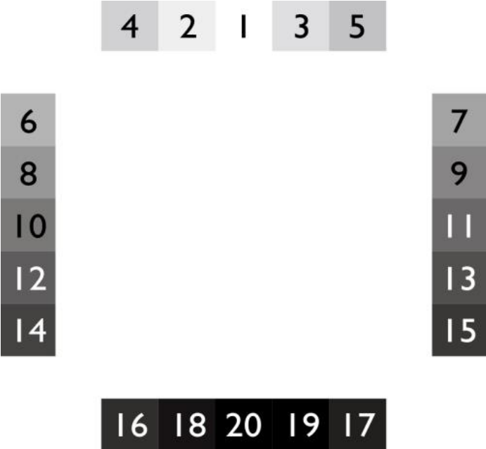 The gray scale, arranged around the central Siemens star, is used to determine the opto electronic conversion function (OECF). It describes how the digital camera transfers luminances into digital values. The patches are analyzed for all three color channels red, green and blue in color images.