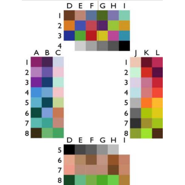 The color patches, are arranged in four blocks around the OECF patches. They are based on the X-Rite ColorChecker SG and are used for evaluation of color reproduction. The patches are converted into color coordinates in the CIE L*a*b* color space (represents the color reception of the human visual system). From these values the color distance Delta E, that describes the color reproduction quality, is calculated.